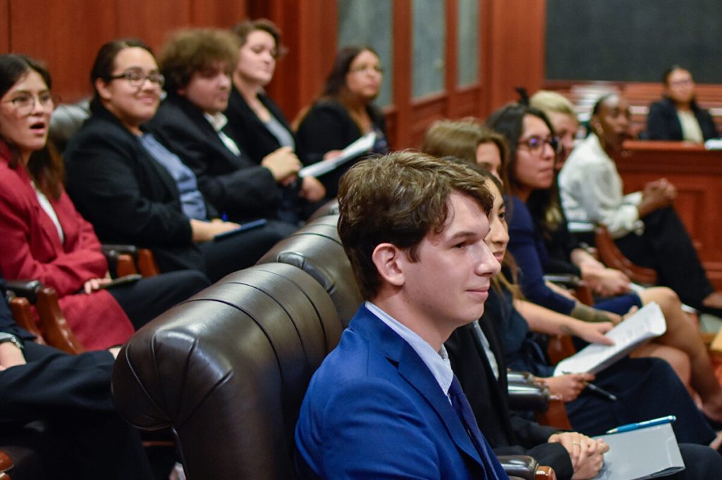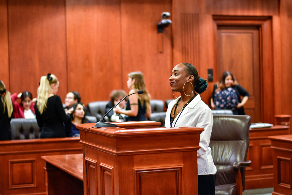 At the conclusion of the four-week program, students prepare and deliver oral arguments before a panel of judges in the law school’s ornate Eidman Courtroom.