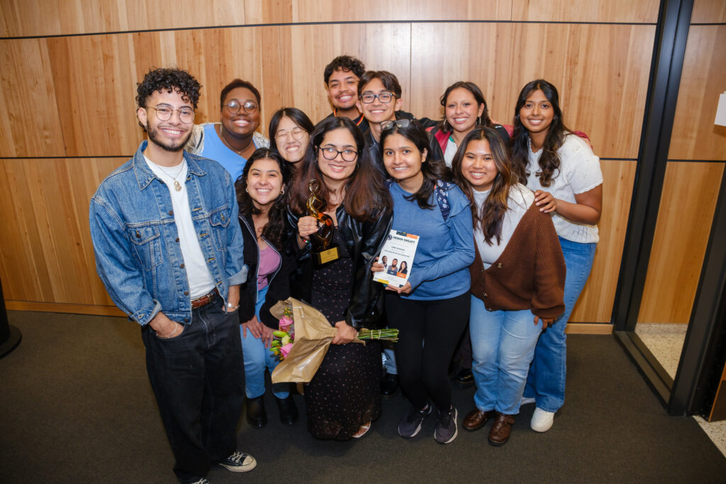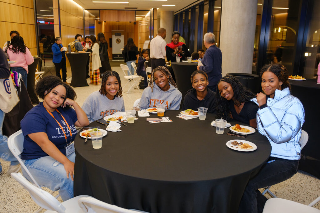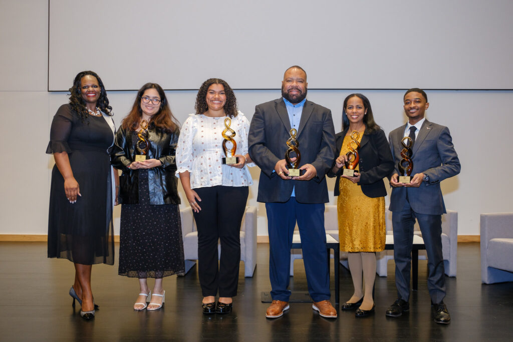 After a brief Q&A following the panel discussion, awards were given to this year’s Heman Marion Sweatt Legacy Award recipients. From left: Dr. LaToya Smith, vice president for diversity and community engagement; Sameeha Rizvi, senior, College of Natural Sciences and Steve Hicks School of Social Work; Ariana Seeloff, senior, College of Liberal Arts; Malik Crowder, assistant director, Multicultural Engagement Center; Dr. Lydia Contreras, professor, Cockrell School of Engineering; vice provost for faculty diversity, equity and inclusivity, Provost’s Office; Mason Porter: senior, College of Liberal Arts.