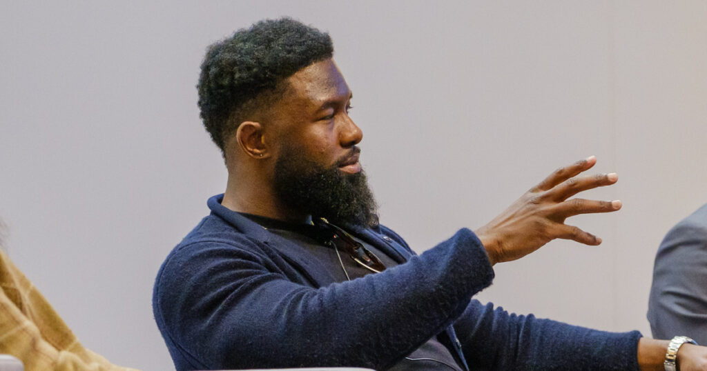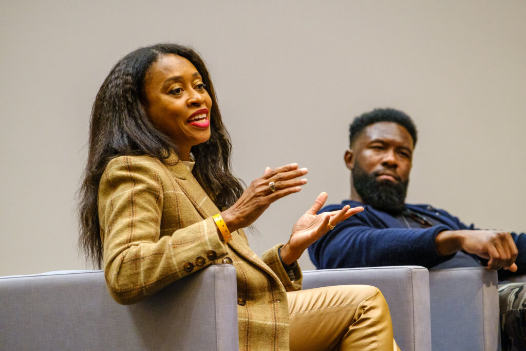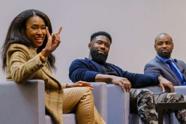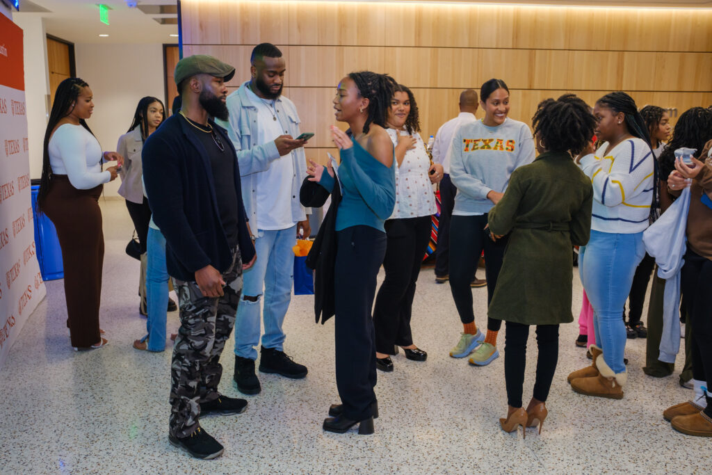 Trevante Rhodes, (B.S., Applied Learning and Development’12) reflected on how his experiences as a UT Track and Field athlete helped fuel his determination to be his very best on the big screen. Now a critically acclaimed actor, Rhodes is best known for his work in the Academy Award-winning film “Moonlight.” He also starred in several films including “BirdBox,” “Bruiser” and “Mike.” In addition to his appearance at the panel discussion, he met with a group of College of Fine Arts students earlier in the day to discuss his craft and his journey from UT Austin to the silver screen.