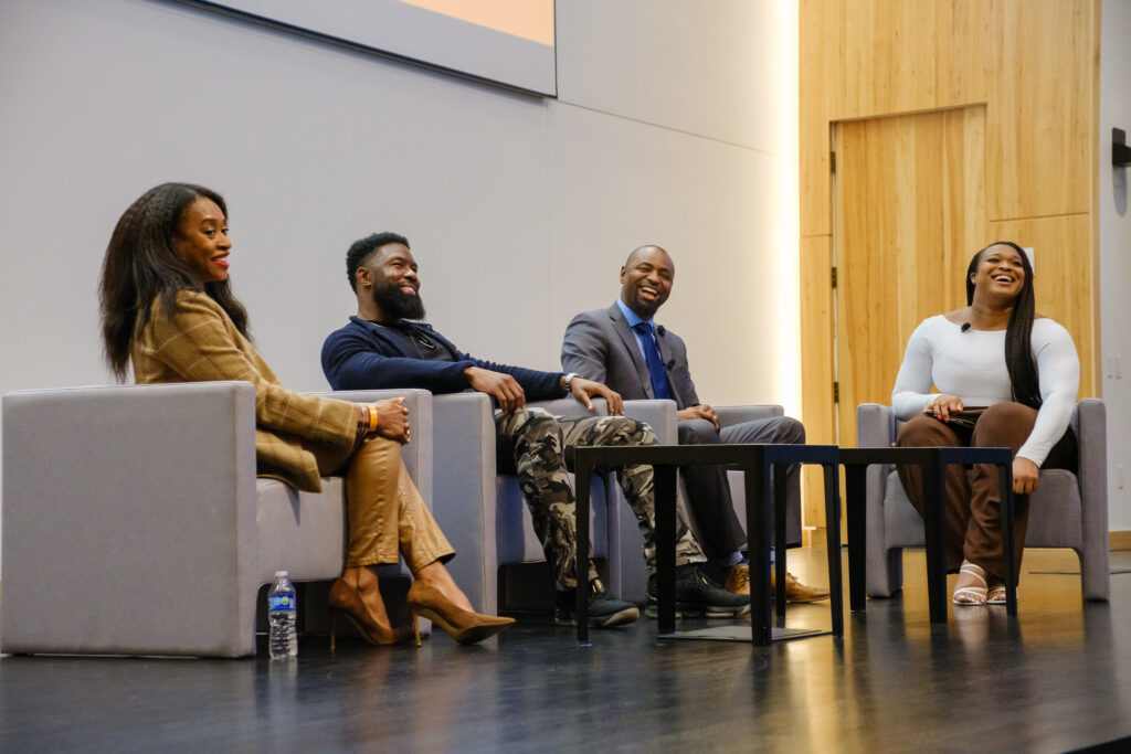 UT Track and Field/Cross Country athlete Marilyn Nwora, starts off the panel discussion with three former student-athletes. Pictured from left: Cynthea Rhodes-Patterson, Trevante Rhodes and Nathaniel Hughes. Nwora (pictured on the right) is a graduate student studying design with a focus on health, and she is a member of the DDCE’s Longhorns for Equity, Access & Diversity (LEAD) initiative.