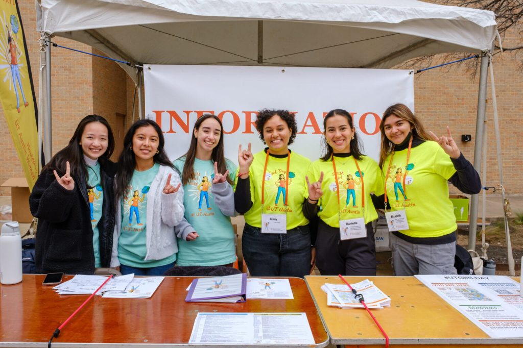 Students show off their Longhorn pride at the info booth. They are among the many volunteers, mentors and STEM role models in attendance at the big event.
