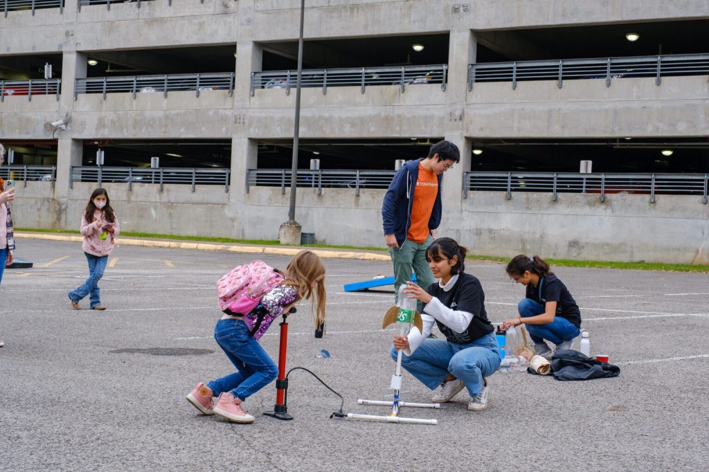 Budding space engineers learn how to make bottle rockets with help from student volunteers.