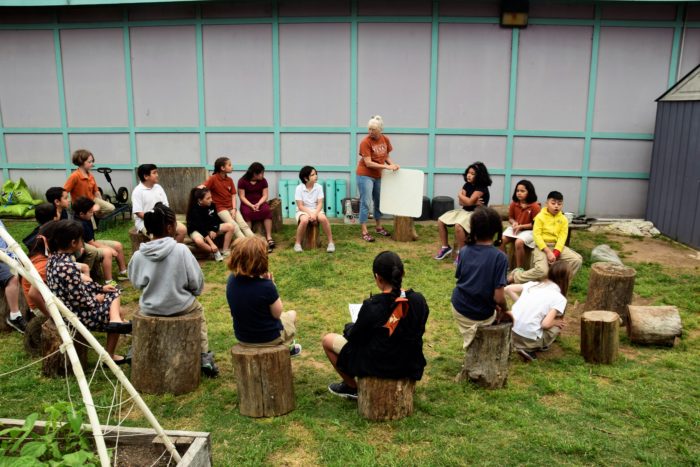 Just around the corner from the University Elementary School cafeteria, a class of second-graders is sitting on tree stump chairs and watching their teacher point to sketches of plants on a handheld white board.